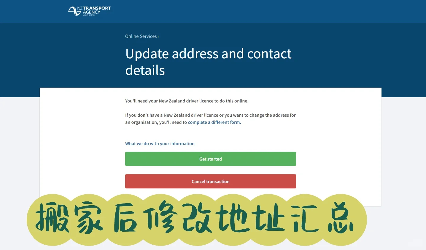 1. **NZTA地址更新**:访问NZTA提供的在线修改页面,更新您的地址,以便接收交通相关信件或罚单,链接为 https://transact.nzta.govt.nz/transactions/ChangeOfAddress/entry.aspx。