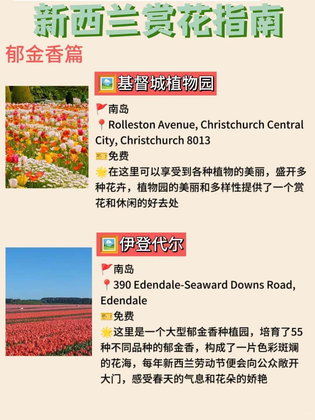 郁金香一般在10月盛开,推荐访问基督城植物园及伊登代尔。