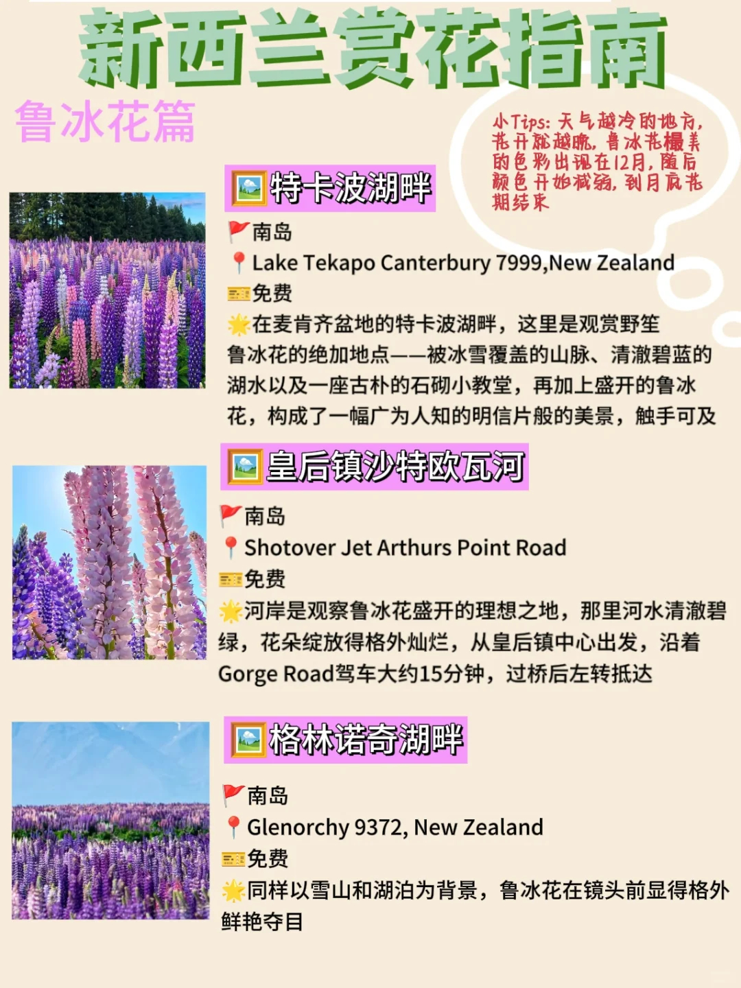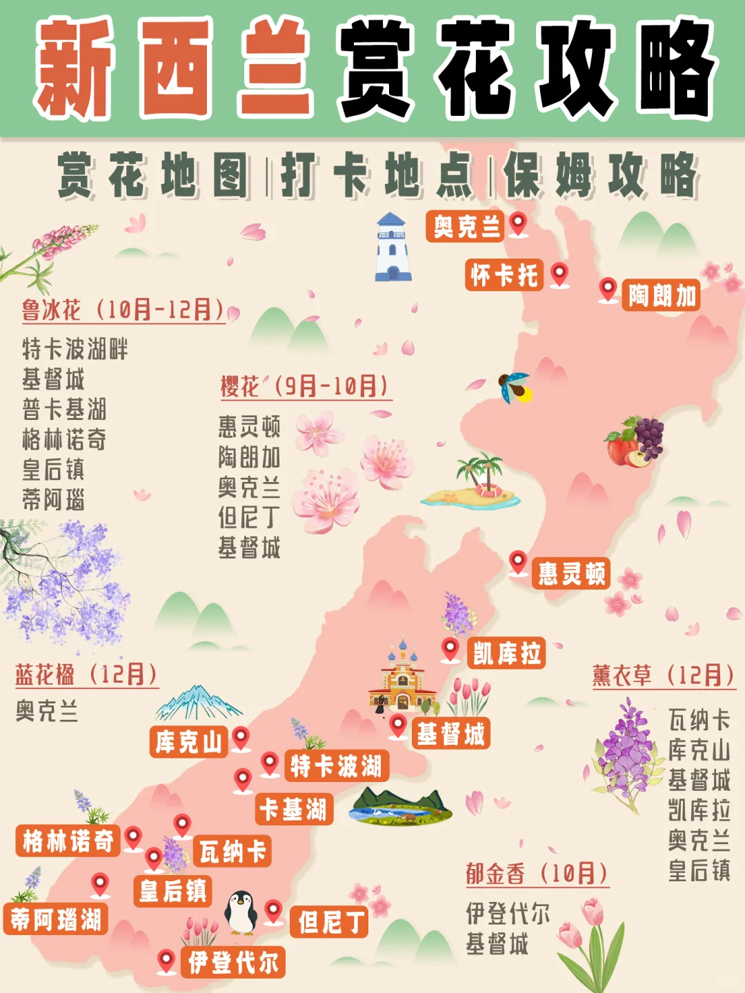 春季气候信息:新西兰的春天从9月到11月,温暖而多变,气温一般在11℃到20℃之间,可能会经历寒冷和晴朗的天气。