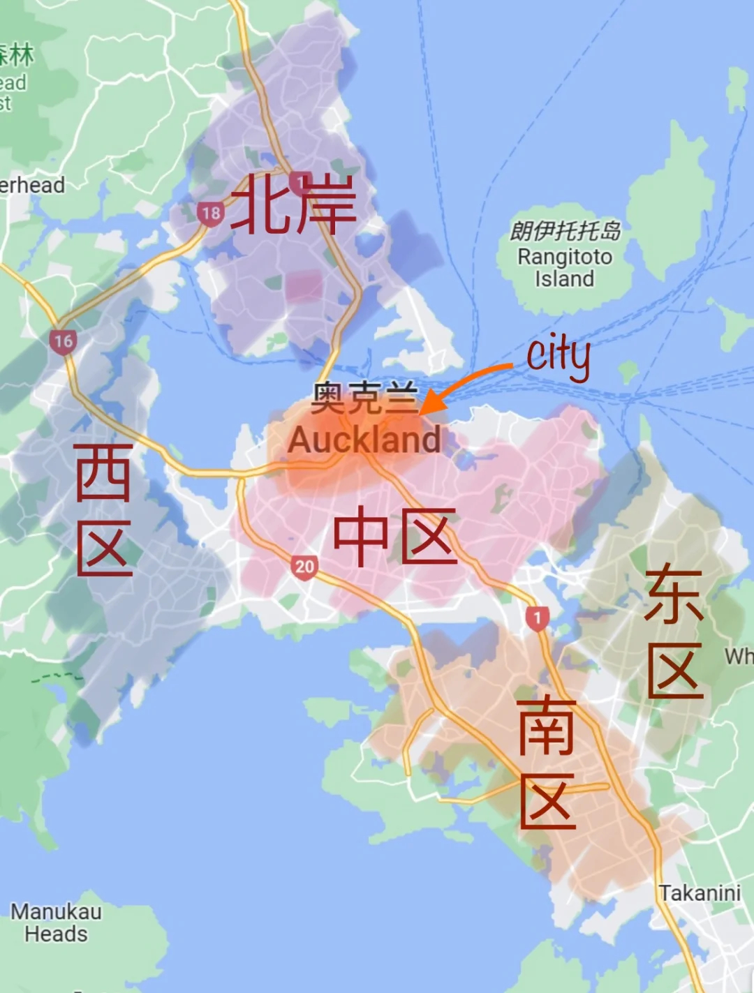 在奥克兰两个月内,我经历了三次搬家和四个不同的住所,总结了一些租房的经验。首先,奥克兰各个区域的分布与特点如下: