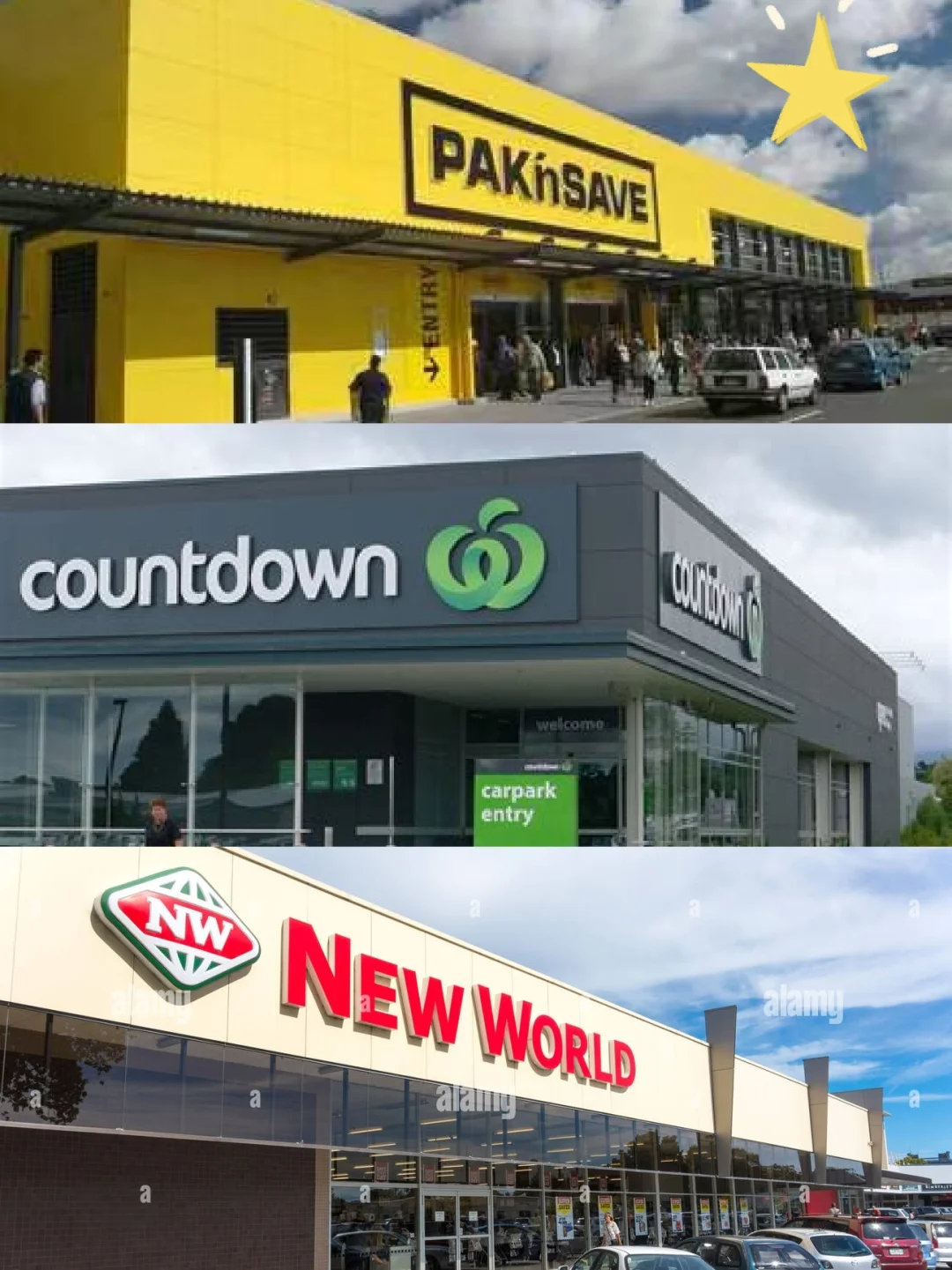 1. 大型连锁超市:价格优势明显,推荐的顺序为黄超(Pak’nSave)> 绿超(Countdown)> 红超(New World)。