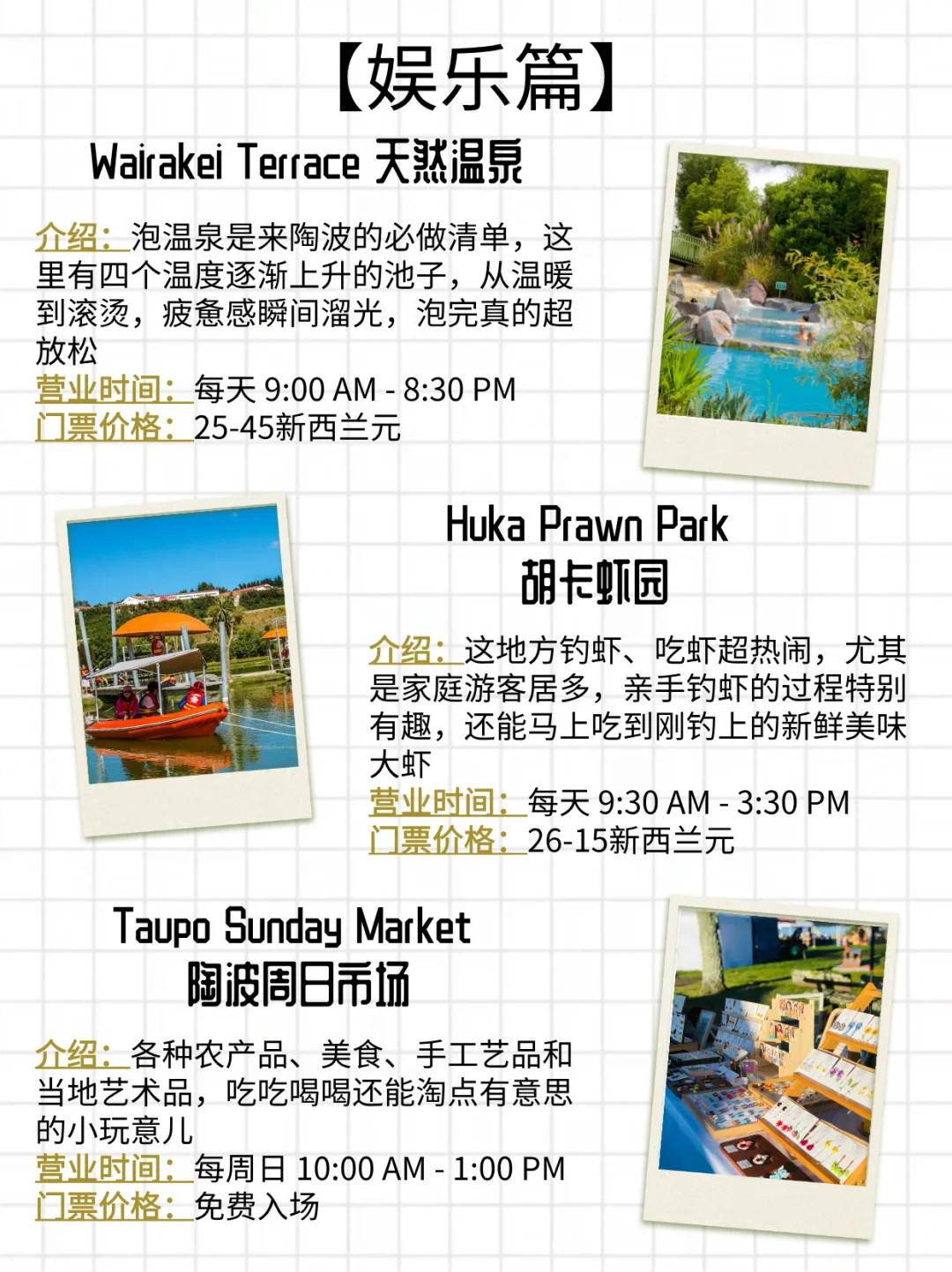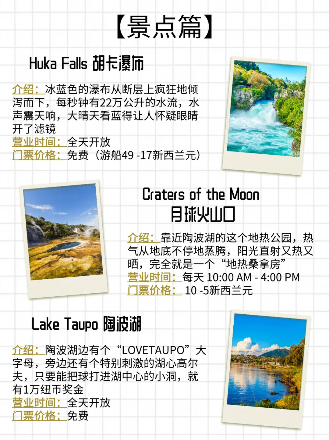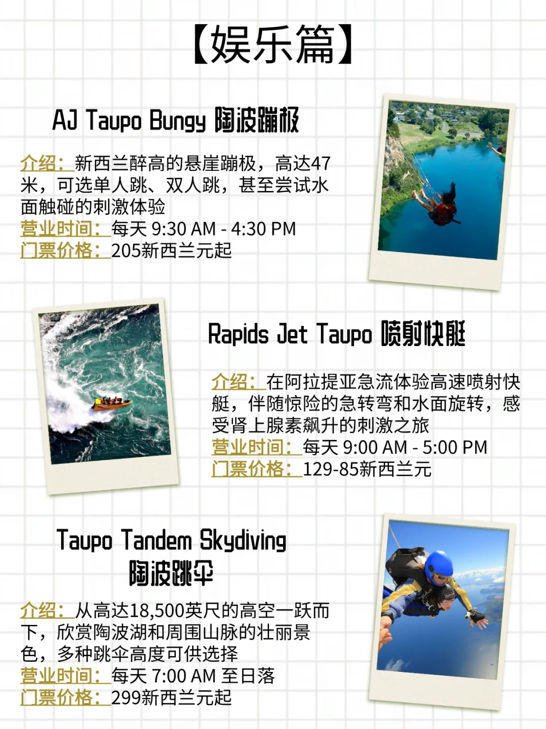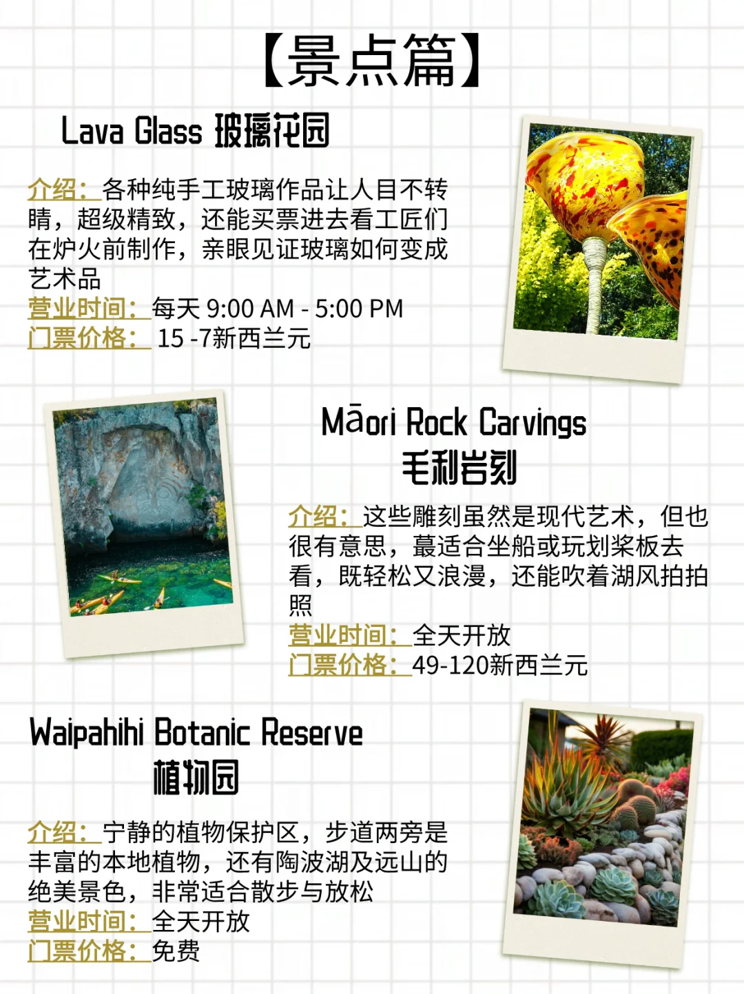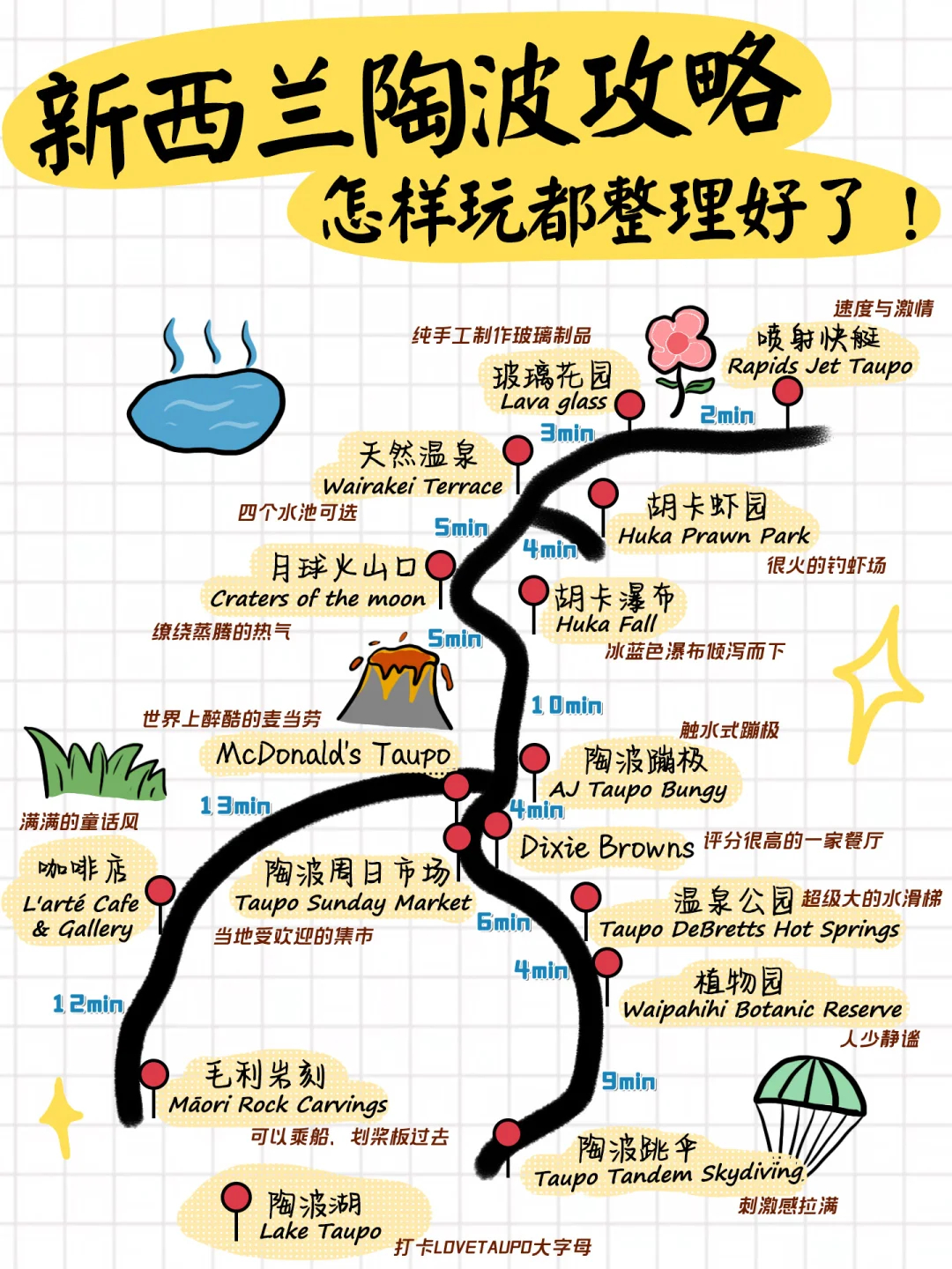 陶波是一个迷人的旅游目的地,虽然它的规模不大,但却拥有充实的精彩活动和美丽的景点。胡卡瀑布以其冰蓝色的水流从断崖倾泻而下,令人叹为观止。月球火山口展现了地底蒸汽的奇观,而陶波湖以其湖边的‘LOVETAUPO’标志成为打卡热点。另外,玻璃花园展示了各种精美的手工玻璃艺术品,令人目不暇接。毛利岩刻是欣赏毛利文化艺术的绝佳去处,推荐乘船或划桨板前往观赏。宁静的Waipahihi植物园则为游客提供一个放松心情的地方。 除了景点,陶波的娱乐活动也同样丰富。泡天然温泉是陶波之行必不可少的体验之一。胡卡虾园提供了亲自钓虾的乐趣,而周日市场则是探索当地艺术和手工艺的好去处。如果你追求刺激,尝试陶波蹦极和跳伞将带给你独特的体验。此外,喷射快艇将在急流中让你感受速度的快感。在美食方面,L'arté Café & Gallery的创意咖啡和高评分的Dixie Browns餐厅是用餐的绝佳选择。 对于计划一日游的游客,可以考虑以下几个路线:路线一涵盖胡卡瀑布、陶波湖、麦当劳和玻璃花园;路线二则是沿湖滨步道,经过几个富有特色的景点;而路线三则包括极具挑战性的蹦极和美味餐厅。若打算深入探索北岛,四天的行程将带你游览奥克兰、汉密尔顿及令人心动的地热公园等地。