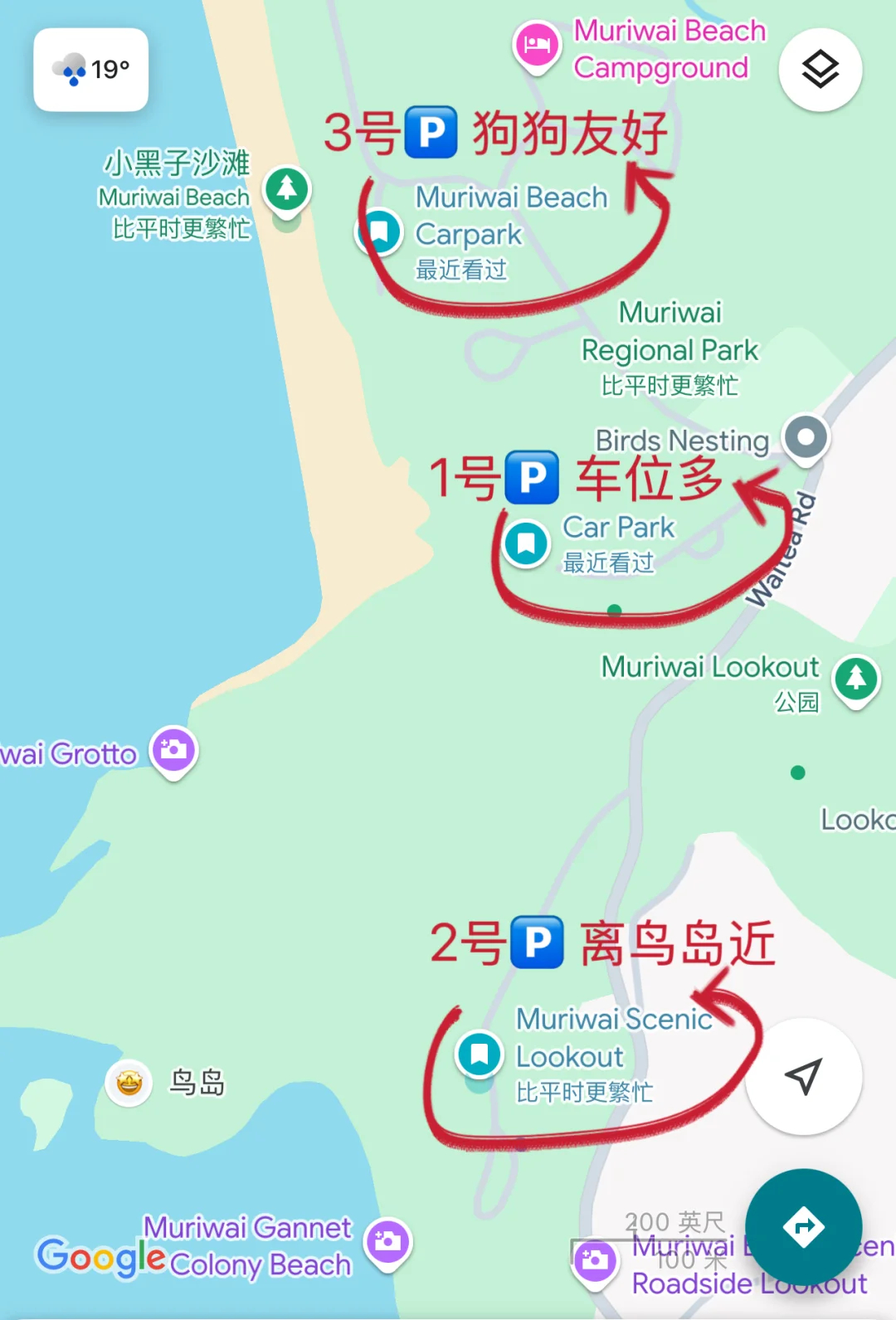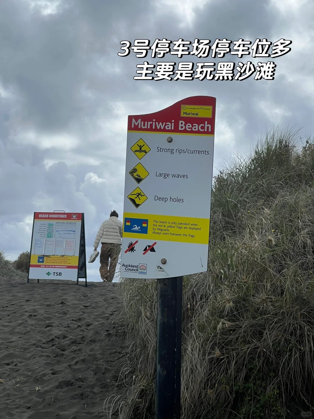 第三个停车场是Muriwai Beach Carpark(Muriwai 0881),适合带狗狗的家庭,虽然鸟岛步道和黑沙滩不允许狗入内,但在停车后可前往允许宠物的沙滩入口,建议观看完鸟岛后再带狗狗到此地玩耍。